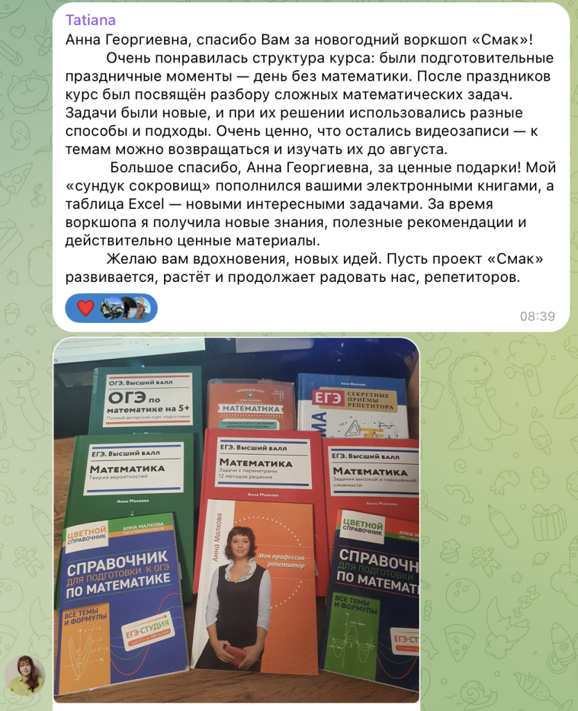 Новогодний воркшоп Анны Малковой для учителей и репетиторов "Смак" - отличная возможность настроится на вторую половину учебного года и повторить сложные задачи 2 части профильного ЕГЭ. Бонусом мы выложили новые книги Анны Малковой, подборки с теорией и задачами и методику преподавания 2 части ЕГЭ.