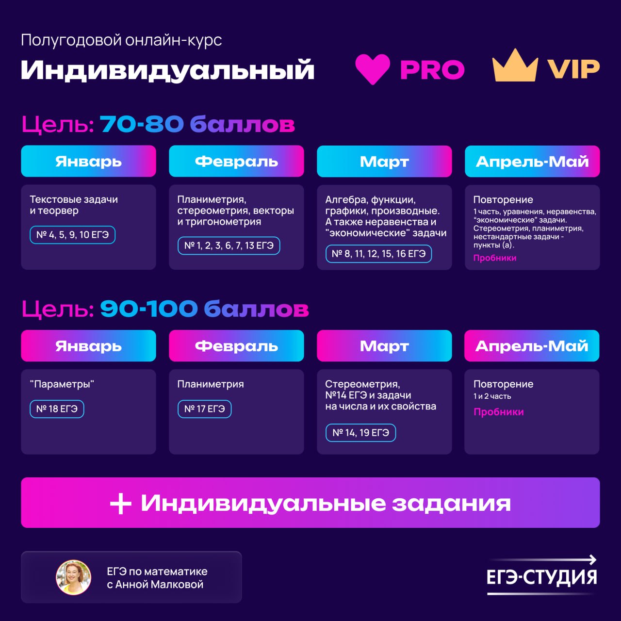 Хотите подготовиться на 70-80 или 90-100? Подключайте Полугодовой индивидуальный для PRO и Полугодовой индивидуальный VIP. Подойдет для 10 и 11-классников.